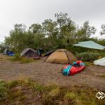 Denn nach dem winterlichen Juni im letzten Jahr mit Flusseinstieg zwischen Eis und Schnee, war es in diesem Jahr skandinavisch-warm, wenn auch in den ersten Tagen verregnet. So verregnet, dass wir alle das erste Camp im Zelt verbracht haben. Am nächsten Morgen bei Sonnenschein war darüber jedoch nur Freude zu hören, denn scheinbar sind wir alle mit etwas zu wenig Schlaf aus unserem Alltag in diese Tour gestartet.
