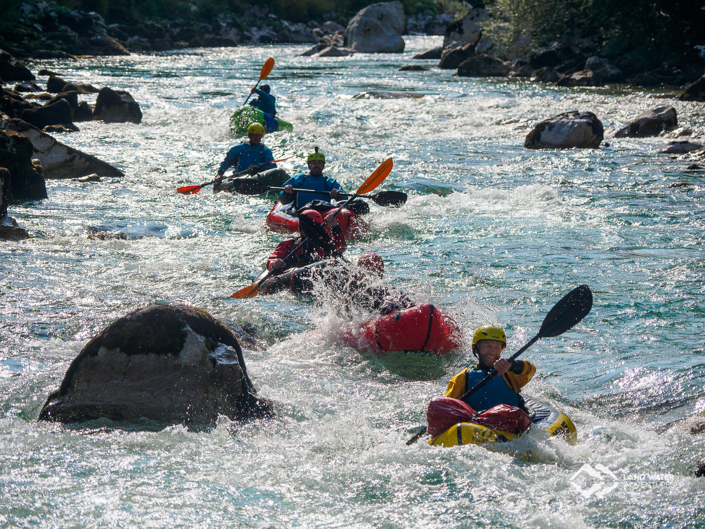 Der 3-Tages-Kurs geht über in einen 5-Tages-Kurs und dem folgt ein Weiterer. Die 5-Tages-Kurse erlauben uns, im Gegensatz zu den dreitägigen Kursen, einen langsameren, intensiveren Aufbau der Packrafting- und Wildwasser-Skills und so können wir am vierten Tag alle mitnehmen – die gesamte Gruppe – in echtes und ernsthaftes WW III, auf die Friedhofstrecke der Soca.